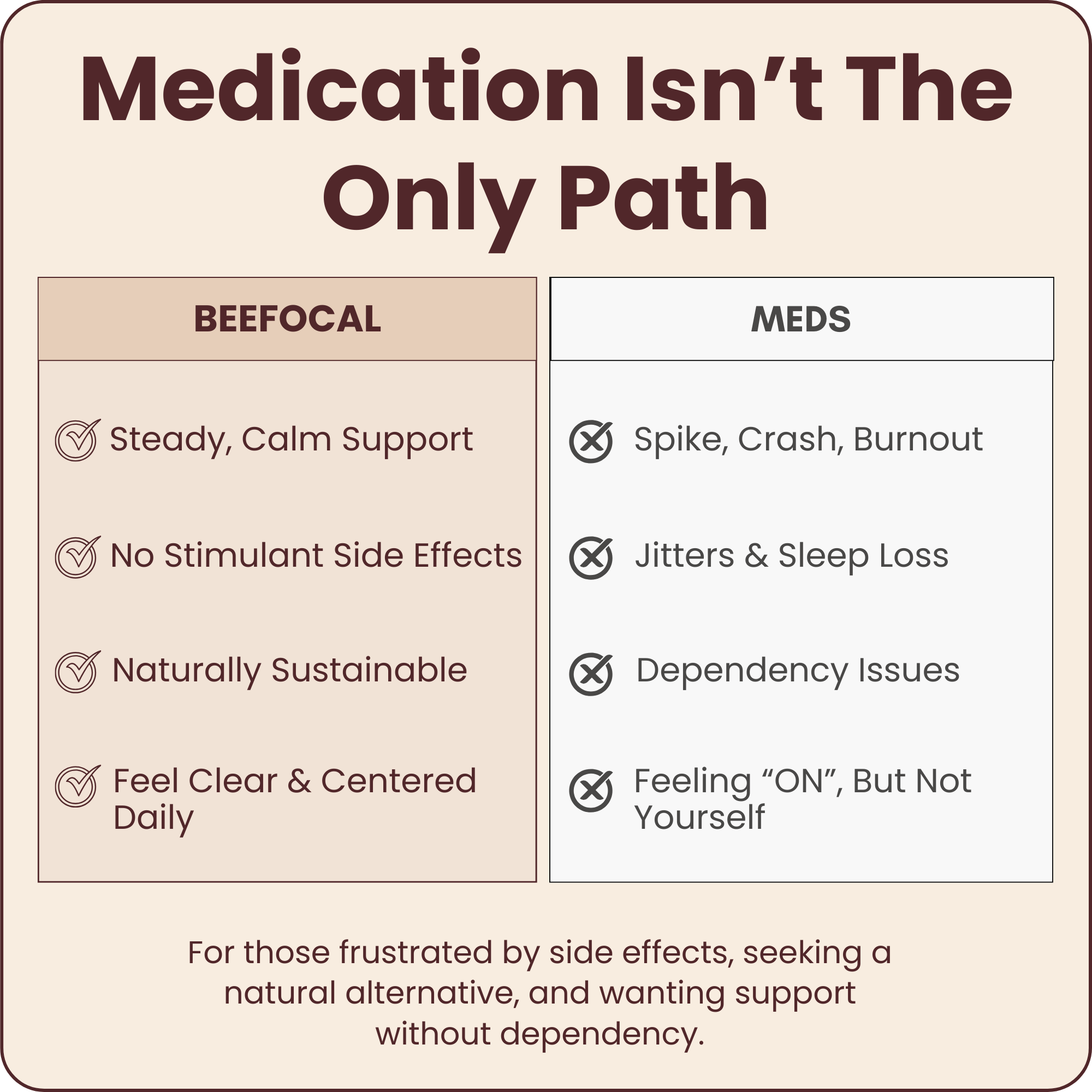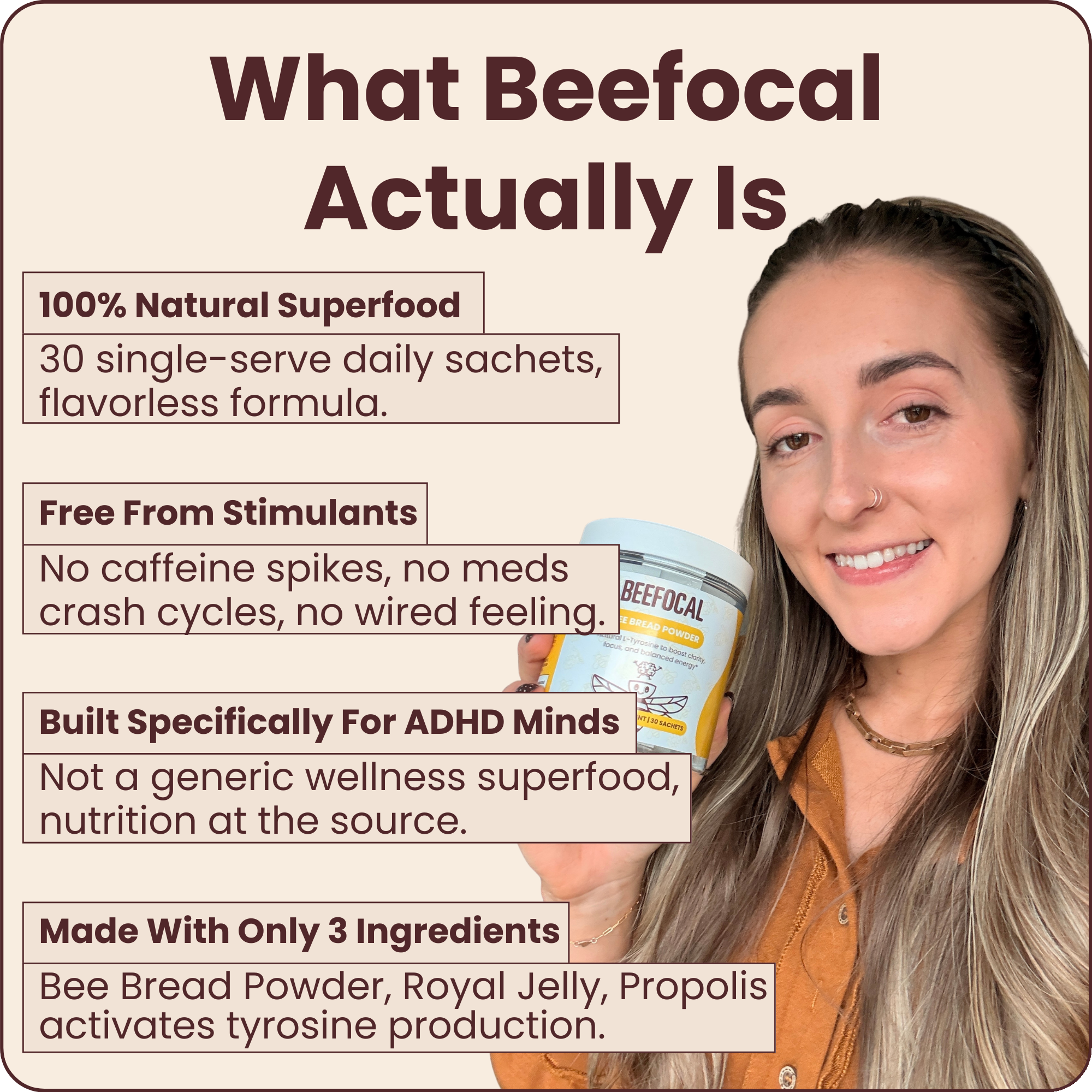 Your brain isn’t failing you, it’s just missing the right fuel. Beefocal bioactive formula is rich in neuro-supportive enzymes, polyphenols, and adaptogenic compounds designed to enhance dopamine regulation, neurotransmitter efficiency, and cognitive endurance.